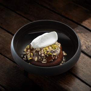 Vanilla Milk Sponge, Saffron Milk, Vanilla Whipped Cream, Pistachio Crushed And Saffron Threads